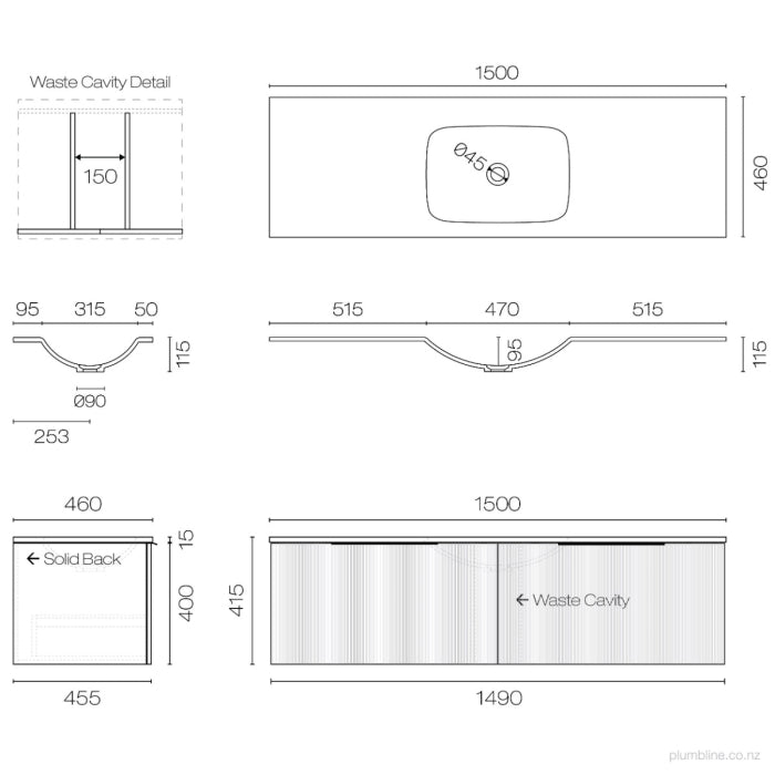 Tap holes and waste holes can easily be drilled by the installer using standard hole saws, or top can be cut out for inset basins.