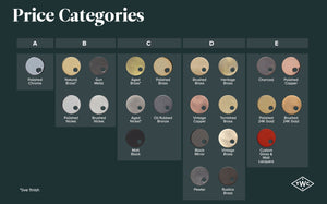 • CATEGORY D = Vintage Copper, Vintage Brass, Heritage Brass, Brushed Brass, Pewter, Rustica Brass, Tarnished Brass, Black Mirror