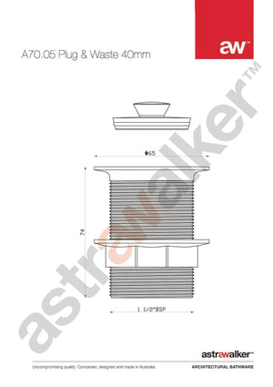 Astra Walker Bath Plug & Waste 40mm No Overflow