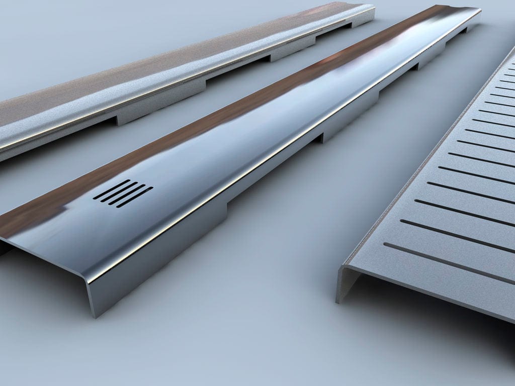 Integrated channel drain in side or back configurations adjacent to wall. Drain covers in your choice of three styles (polished plain, polished slotted or tile-over)