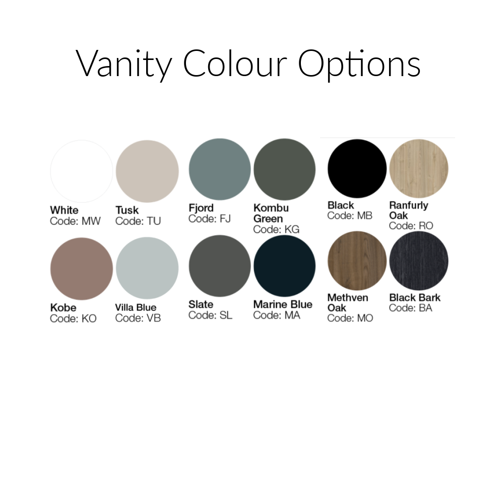 • When ordering this vanity please contact us to advise of your colour option: Comes in White, Lana Grey, Tusk, Kobe, Villa Blue, Fjord, Atmoss, Kombu Green, Slate, Marine Blue, Matte Black, Ranfurly Oak, Methven Oak, Black Bark, Tahoe Walnut