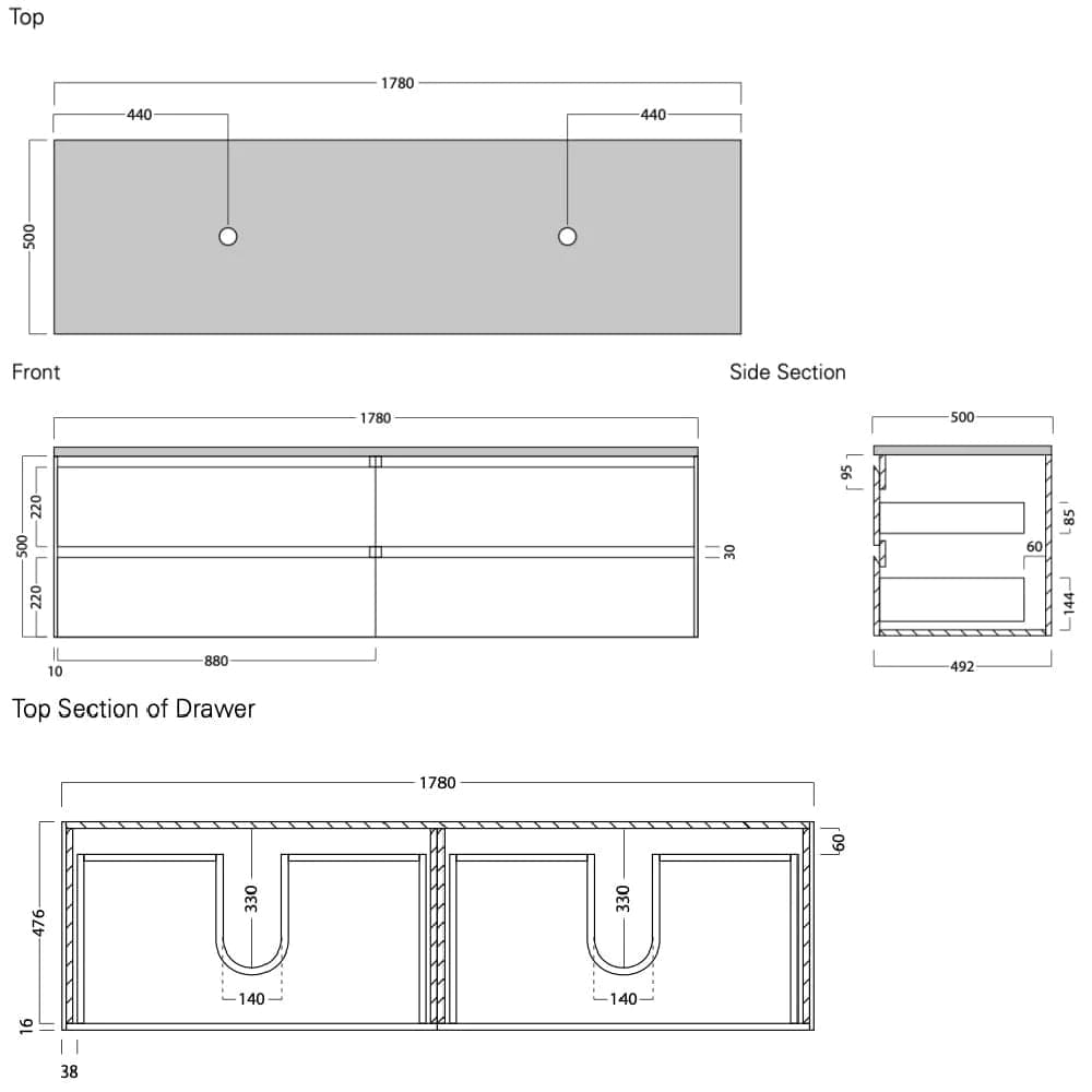 Dimensions: 1780mm W x 500mm D x 500mm H