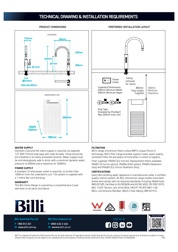 Supplied standard with 994052 sub-micron filtration from BWT to deliver the freshest tasting water and ensure the health of your family & guests.