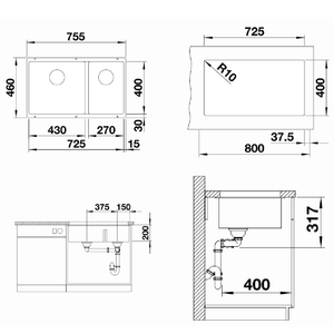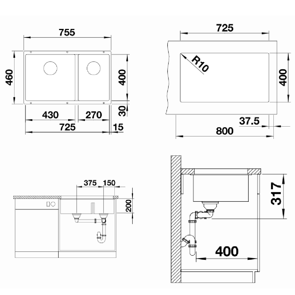 Internal Bowl Size: 430 x 400mm + 270 x 400mm