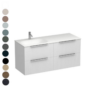 A collection inspired by the latest global trend of fluted finishes where the linear moulded Forma cabinetry is combined with the sleek contoured solid surface Spio basin. The drawers are offered in multiple colour options and finished with a slimline handle in your choice of colours. The Forma Spio collection will add texture and style to any new bathroom.