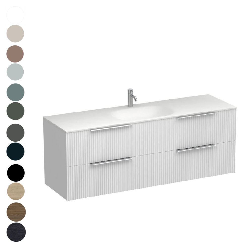 A collection inspired by the latest global trend of fluted finishes where the linear moulded Forma cabinetry is combined with the sleek contoured solid surface Spio basin. The drawers are offered in multiple colour options and finished with a slimline handle in your choice of colours. The Forma Spio collection will add texture and style to any new bathroom.