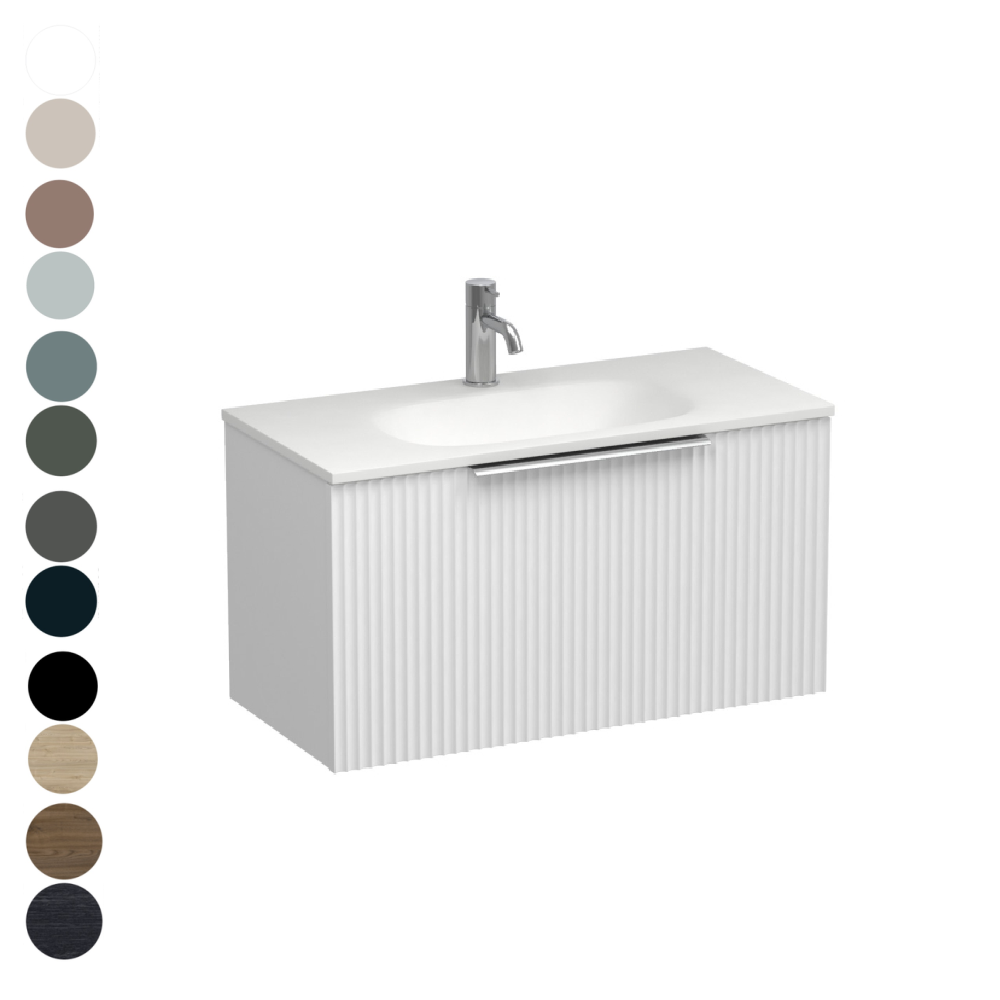 A collection inspired by the latest global trend of fluted finishes where the linear moulded Forma cabinetry is combined with the sleek contoured solid surface Spio basin. The drawers are offered in multiple colour options and finished with a slimline handle in your choice of colours. The Forma Spio collection will add texture and style to any new bathroom.