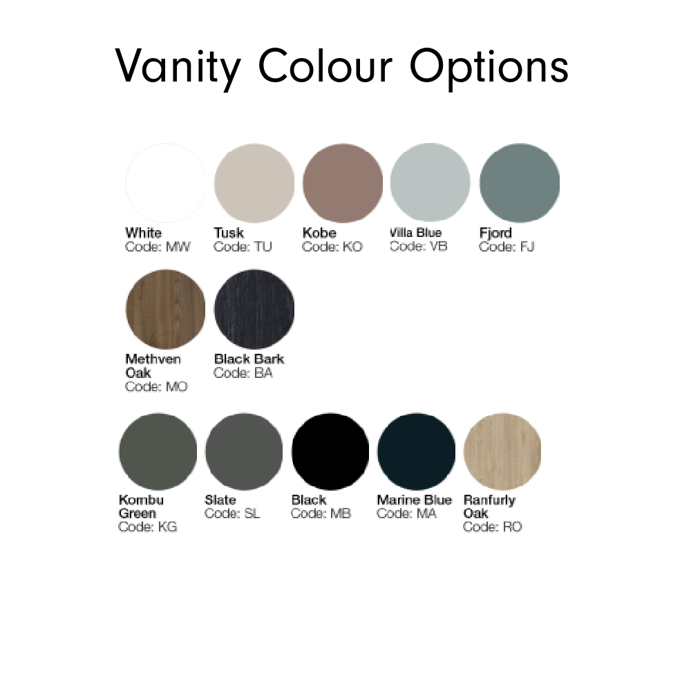 • When ordering this vanity please contact us to advise of your colour option: Comes in White, Lana Grey, Tusk, Kobe, Villa Blue, Fjord, Atmoss, Kombu Green, Slate, Marine Blue, Matte Black, Ranfurly Oak, Methven Oak, Black Bark, Tahoe Walnut
