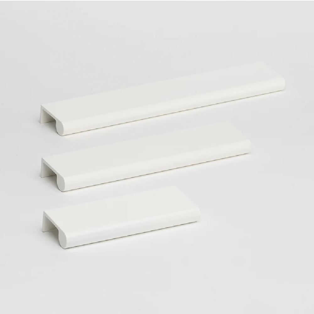 The Lo&Co made of solid brass and powder coated white. The Lincoln Pull features a comfortable rounded edge lip pull. Designed to sit flush on cabinetry, this handle requires a recess of 3mm. Comes in 3 lengths, 130mm, 200mm and 260mm. All with a 45mm projection.
