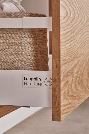 The Airlie Vanity boasts a streamline design incorporating deep drawers with a timber detailed finger pull and featuring shaker profile end panels. Designed by Kyal & Kara and meticulously handcrafted by Loughlin Furniture.