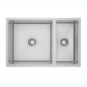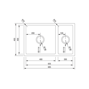 Internal Dimensions: 400 x 400mm + 200 x 400mm Overall Dimensions: 685 x 450mm Bridge: 35mm Bowl Depth: 200mm + 160mm Corner Radius: 10mm Material: 1.2mm, 304 Grade Stainless Steel Minimum Cabinet Size: 700mm Edge Detail: 25mm Flat Reversible: Yes Installation: Top, Under or Flush Mounted Waste: 2 x 90mm Basket Waste & 1 x Overflow Kit