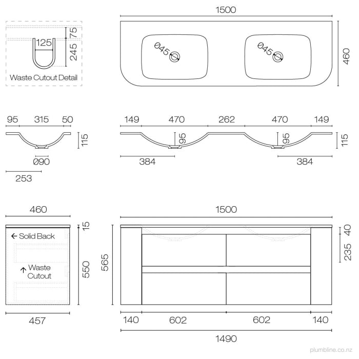 Tap holes and waste holes can easily be drilled by the installer using standard hole saws, or top can be cut out for inset basins.