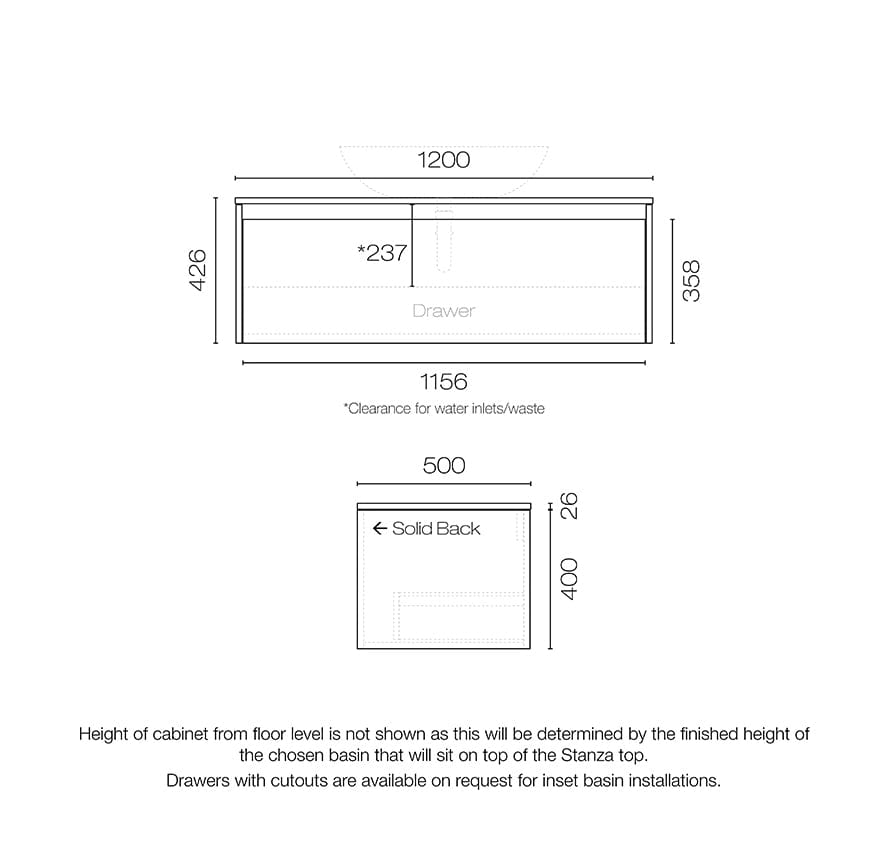 Tap holes and waste holes can easily be drilled by the installer using standard hole saws, or top can be cut out for inset basins.