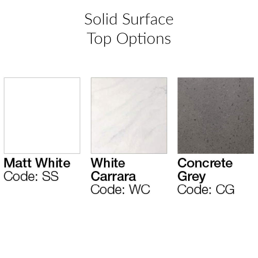 Tap holes and waste holes can easily be drilled in the solid surface tops with hole saws supplied, or top can be cut out for inset basins on site by installer using a jig saw.